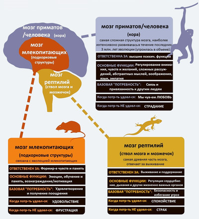 Эмоции помогли нашим предкам успешно выжить и передать свои гены, преодолевая множество препятствий и опасностей. Положительные эмоции указывают на то, что мы возвращаемся в «зону комфорта», которая способствуют выживанию, а отрицательные отражают «зону дискомфорта», которая указывают на то, что мы находимся в ситуациях, которые могут ухудшить выживание. Это наследственные инструменты для жизни – эволюционная память, закодированная в наших генах. |
